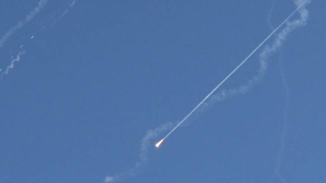 ▲ 현지 시간 22일 예루살렘 상공에 보이는 탄도미사일을 요격하려는 이스라엘의 미사일 방어 시도