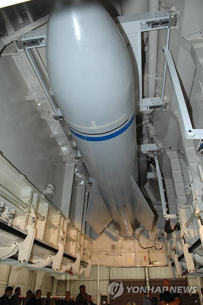 사진은 미국 공군이 AFP통신을 통해 배포한 2007년 12월 18일 미주리주 휘트먼 공군기지에서 무기전문가들이 B-2 폭격기에 장착된 벙커버스터 실물크기 모형을 바라보는 모습. 2025.6.22 [미 공군 제공·AFP 자료. 재판매 및 DB 금지]