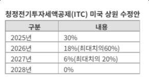미국 공화당 소속 마이크 크레이포 상원 재무위원장이 지난 16일(현지시간) 공개한 IRA 수정안 초안에 따르면, 태양광·풍력 등 재생에너지 프로젝트에 대한 ITC는 올해부터 단계적으로 축소돼 오는 2028년 전면 종료될 예정이다. 기존 하원안이 오는 2032년까지 30% 공제를 유지했던 것과 비교하면 종료 시점이 4년 이상 앞당겨진 셈이다.