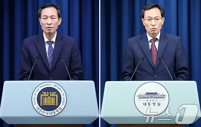사진 오른쪽은 우상호 정무수석이 지난 19일 서울 용산구 대통령실 청사 브리핑룸에서 현안 관련 브리핑을 하는 모습. 2025.6.22/뉴스1