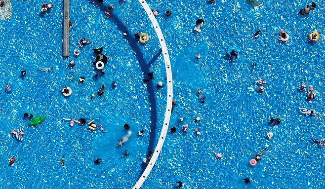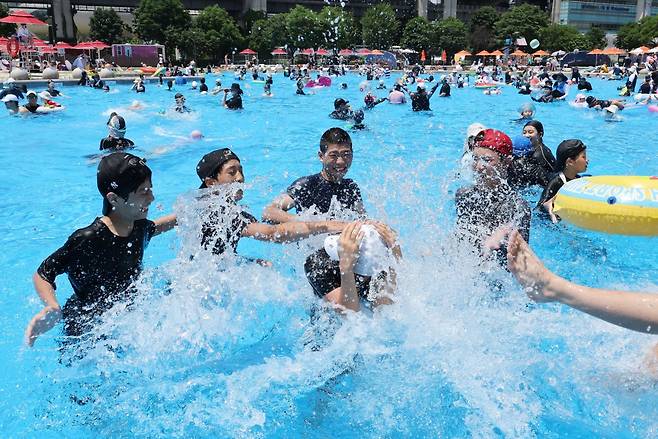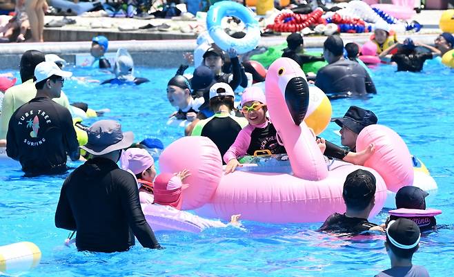 낮 기온 30도 안팎의 무더운 날씨를 보인 22일 서울 광진구 뚝섬한강공원 야외수영장을 찾은 시민들이 물놀이를 즐기며 더위를 식히고 있다.