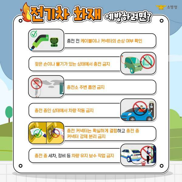 또한, 차량 내 소화기를 항상 비치해 초기 화재에 신속 대응할 수 있도록 하는 등 적극적인 예방 행동이 요구된다. 김도연 예방안전과장은 "전기차 화재는 진압이 어려워 작은 사고라도 대형 피해로 번질 위험이 크다"며 "운전자 스스로 안전수칙을 철저히 지키는 것이 무엇보다 중요하다"고 강조했다.