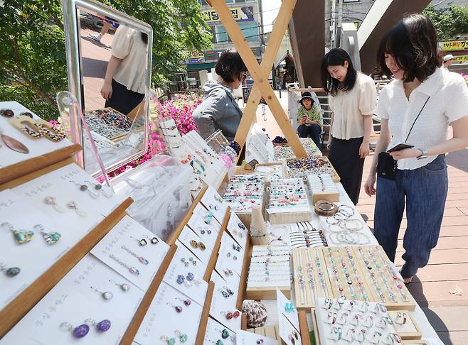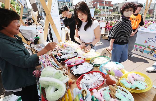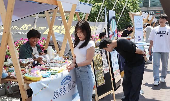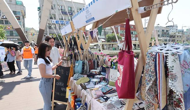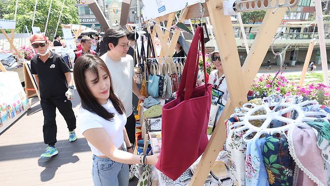 22일 서울 관악구 서원보도교에서 열린 '별별물건마켓'을 찾은 시민들이 물품을 살펴보고 있다.