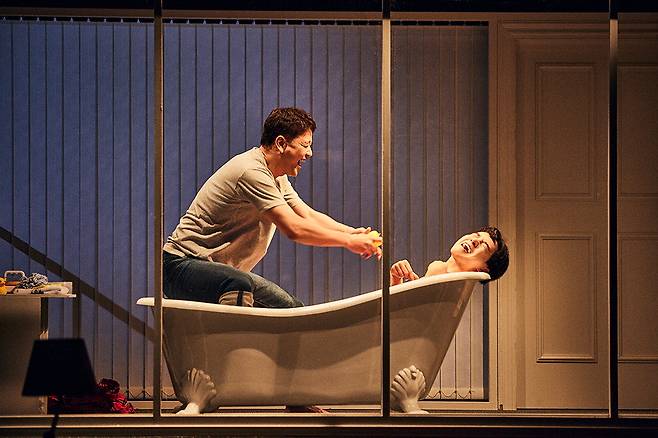 연극 '킬 미 나우'(연출 오경택)는 주인공이 욕조에 잠겨 있는 장면으로 시작한다. 무대 뒤편 샤워실의 커튼이 걷히면 촉망받는 소설가였던 제이크(이석준·배수빈)가 사지를 가누기 힘든 열일곱 살 지체장애인 아들 조이(최석진·김시유·이석준)를 목욕시키고 있다.