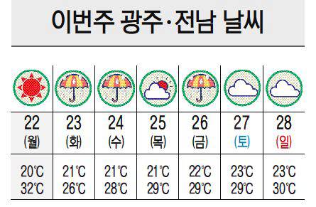 22일 광주지방기상청에 따르면 이번주 광주·전남은 고기압 가장자리에서 남서쪽의 따뜻하고 습한 공기가 유입되면서 대체로 흐리고 무더운 날씨가 계속될 것으로 보인다. 차차 남하하는 정체전선의 영향을 받아 일부 지역에서는 비가 내리는 곳이 있겠다.