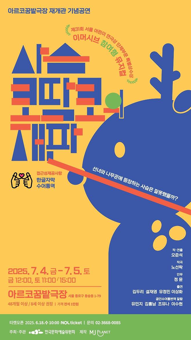 덧붙이는 글 | 공연명: 사슴 코딱코의 재판 / 일시: 2025년 7월 4일(금) 낮 12시 10분 / 5일(토) 오전 11시, 오후 3시 장소: 아르코꿈밭극장 / 관람연령: 48개월 이상 (8세 이상 권장) / 관람시간: 70분 / 관람료: 전석 1만원 (인터파크 티켓 예매) / 주최/주관: 한국문화예술위원회 / 제작: 엠제이플래닛