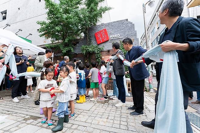 | ▲ 어린이들이 참가하여 더욱 흥겹고 신명난 <아르코꿈밭극장> 현판식 사진. 2024년 7월 17일, 한국문화예술위원회가 어린이·청소년 관객을 위해 대학로에 문을 연 ‘아르코꿈밭극장’의 개관식이 개최됐습니다 |