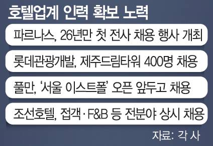호텔들은 인재 확보를 위해 채용박람회를 개최하는 등 자구책 마련에 나섰다. 파르나스는 지난달 1999년 이후 26년 만에 처음으로 대규모 채용박람회 ‘파르나스 커리어 페어’를 개최했다. 신규 직원 200여명을 채용하기 위한 행사다. 한 호텔업계 관계자는 “젊은 구직자들은 화려해 보이는 외양과 달리 노동 강도가 세고 보수는 낮은 호텔 취업을 점점 꺼리는 추세”라며 “인력 부족 문제는 당분간 이어질 것으로 보인다”고 말했다.