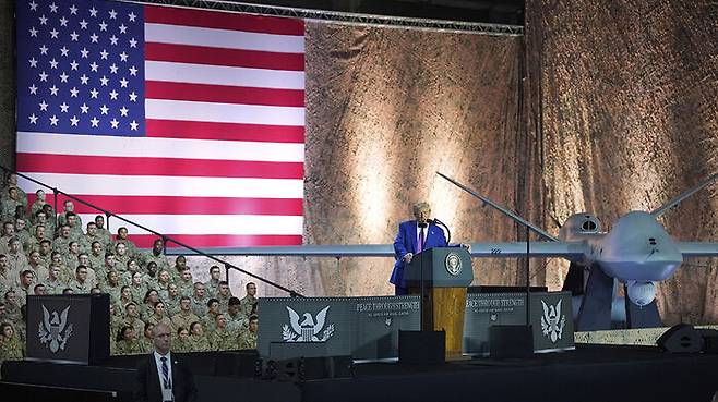 ▲ 현지 시간 지난달 15일 카타르의 알우데이드 공군기지 찾은 도널드 트럼프 미국 대통령
