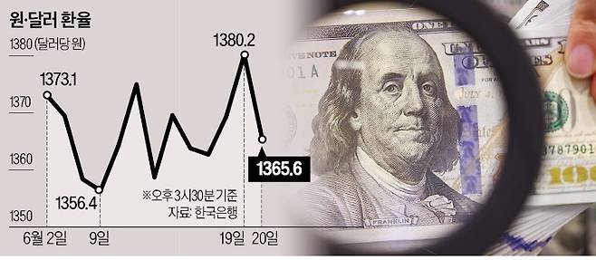 지난주 원·달러 환율은 중동 지역의 긴장 고조와 미국 중앙은행(Fed)의 강경한 금리 인상 기조가 맞물리면서 한때 1380원을 넘어서기도 했다. 하지만 주 후반 국내 증시가 강세를 보이자 투자 심리가 다시 살아나면서 환율이 1360원대까지 내려갔다.