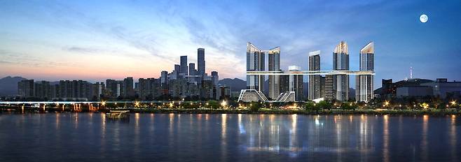 HDC현산은 단지명을 '더라인 330'(투시도)으로 제안했다. 한강변을 따라 단지 내 초고층 타워를 연결하는 길이 330m의 스카이브리지를 내세운 이름으로, 조합원 수 441명을 크게 웃도는 총 600가구의 한강 조망이 가능한 설계를 선보이겠다는 계획이다.