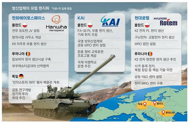 수출이 아닌 현지화에 나선 것은 유럽 국가들이 국방비로 유럽연합(EU) 소속 국가의 무기를 구매하도록 한다는 방침 때문이다. 이에 한국 방위산업체들은 유럽 지역에 생산시설을 추가하고 유럽 업체와 조인트벤처(JV)를 설립하는 식으로 현지화를 추진하고 있다. 방산업체 관계자는 "현지화가 선택이 아닌 필수라는 결정을 내렸고, 업계 전체의 유럽 투자 계획도 조 단위를 넘어서고 있다"고 전했다.