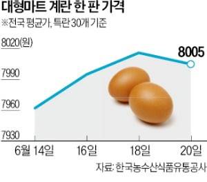 대형마트는 4년 만에 최고치를 기록한 계란 가격 인상을 최대한 절제하고 있다. 홈플러스는 특란 한 판(30개) 가격을 2년 전부터 유지해온 7990원으로 동결했다. 납품가가 작년보다 20%가량 올랐지만 마진을 줄여 인상을 억제했다고 설명했다. 이마트와 롯데마트도 각각 7980원, 7990원 수준으로 가격을 유지하며 8000원 선을 넘기지 않고 있다.