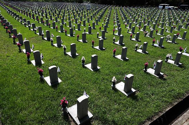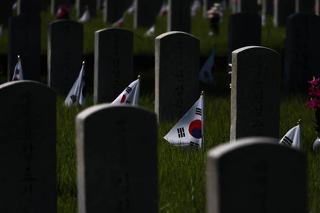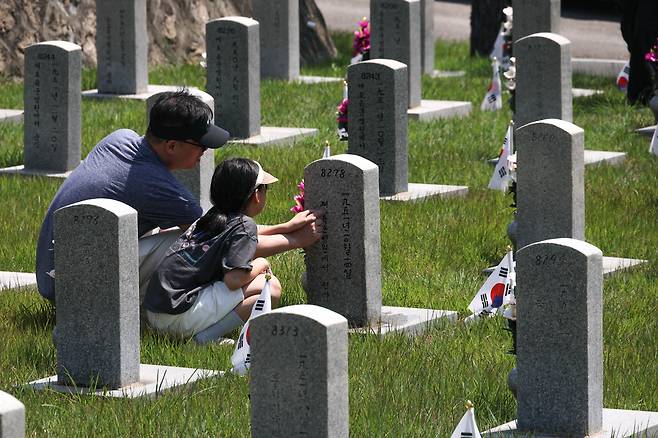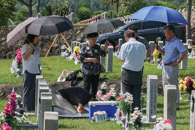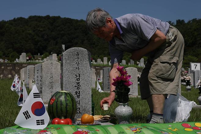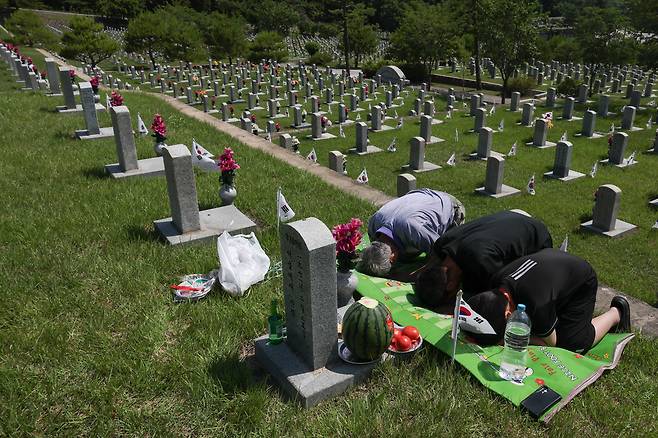 6·25전쟁 75주년을 사흘 앞둔 22일 서울 동작구 국립서울현충원에는 이른 아침부터 호국 영웅들의 묘역을 찾은 유족들과 시민들의 발길이 이어졌다. 전사자의 가족들은 묘비 앞에 음식과 술을 차려놓고 고인의 넋을 기렸다. 이날 카메라에 담은 현충원의 모습을 모았다.