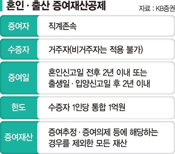 22일 KB증권에 따르면 지난해 1월부터 시행된 혼인·출산 증여재산공제는 부모와 결혼을 준비하는 자녀 간에 활용되고 있다. 수증자(증여받는 사람) 1인당 통합 1억원 한도로 적용된다. 다만 혼인·출산 증여재산공제를 적용하려면 세부 요건을 잘 따져봐야 한다는 조언이다.