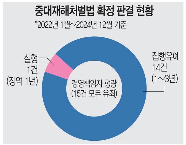 실제 중처법 위반으로 대표가 실형을 선고받는 사례는 드물다. 고용노동부에 따르면 법 시행 이후 지난해 12월까지 유죄가 확정된 사건은 15건에 그쳤다. 이 중 경영책임자가 실형을 확정받은 사례는 징역 1년이 선고된 1건뿐이다. 나머지 14건은 모두 징역형의 집행유예가 선고됐다.
