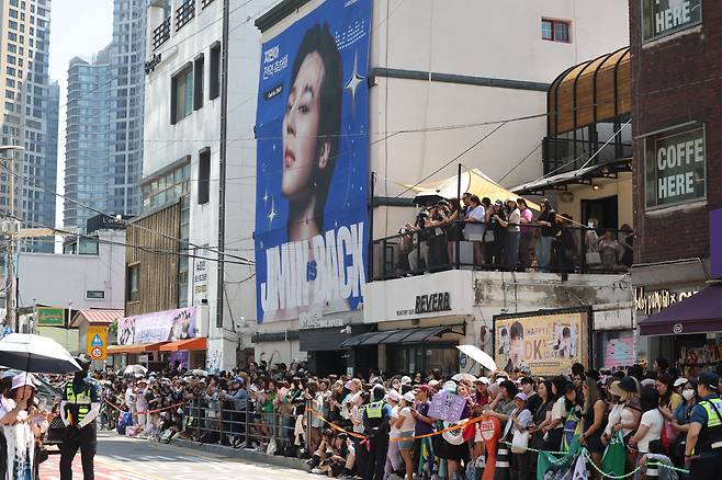 | ▲ 방탄소년단(BTS) 멤버 지민과 정국의 전역일인 6월 11일 서울 용산구 하이브 사옥 앞에서 국내외 아미(ARMY·BTS의 팬덤)들이 축하하고 있다. |