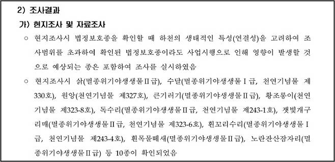 | ▲ 황강 청덕지구 하천정비사업 환경영향평가서(2022)의 일부. 현지조사에서 발견한 법정보호종 10종을 수록하고 있다. |