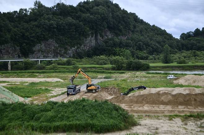 | ▲ 황강 삽질 현장 황강에서 환경부에 의한 4대강사업 식의 삽질이 자행되고 있다. ⓒ 정수근 |