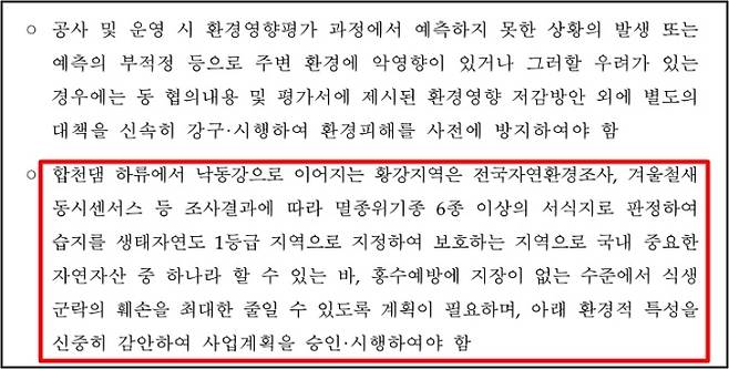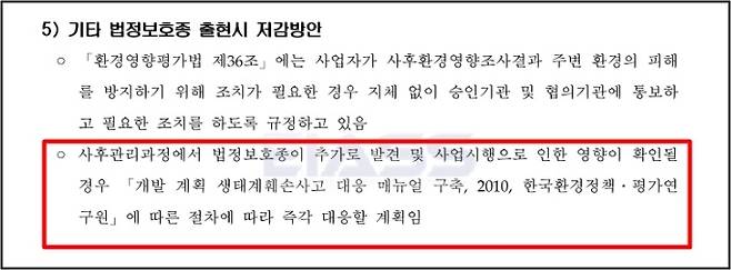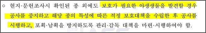 | ▲ 황강 청덕지구 하천정비사업 환경영향평가서(2022)에는 '새로운 법정보호종이 나타나면 반드시 그 종에 대한 대책을 수립할 것'을 요구하고 있다(노란색 강조). |