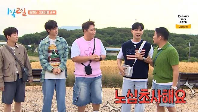 이후 멤버들은 충청남도 보령시에 모였다. 김종민이 신혼여행을 떠나 5명 멤버만 모인 상황. 멤버들은 "톡방에 사진 올려준 거 보니까 합성한 것 같다"라고 밝혔다. 특히 딘딘은 "에펠탑이 보이는 그 사진을 보는데, 너무 '1박 2일' 같더라. 어디 벽지 앞에서 찍은 것 같다"라며 의심했다.