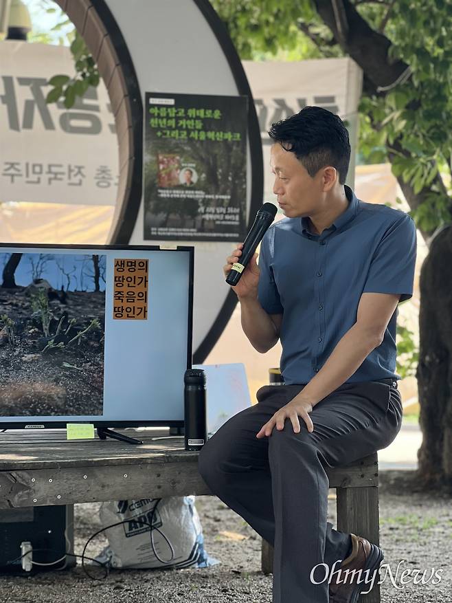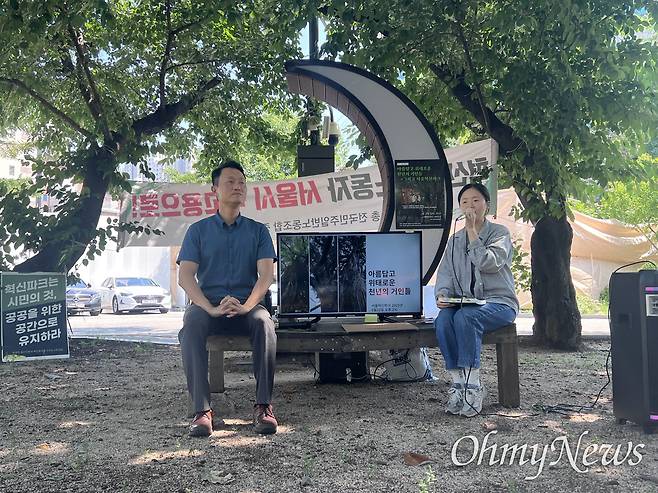 김 작가는 이날 서울시의 서울혁신파크 민간 매각 시도에 대해 "이렇게 자투리 공간만 있어도 좋고 (나무그늘이 있어) 시원하지 않나"라면서 안타까움을 표했다.