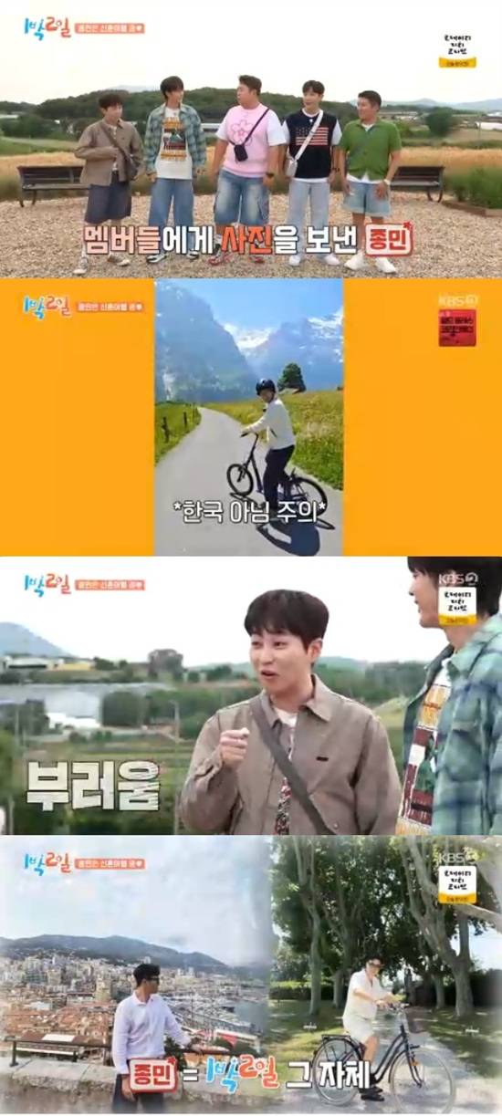 멤버들은 김종민이 보내준 신혼여행 사진을 두고 "합성 같다", "'1박2일' 같다", "너무 웃겼다"고 입을 모았다.