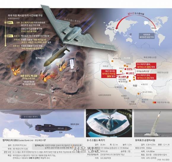 같은 시간 미 해군 잠수함은 우라늄 농축시설인 나탄즈와 이란 최대 핵 연구시설이 있는 이스파한에 토마호크 순항미사일 30발을 퍼부었다. 나탄즈에는 벙커버스터 2발도 투하됐다. 작전이 성공했다는 보고를 받은 트럼프 대통령은 오후 7시 50분 트루스소셜에 글을 올리고 “이란 핵시설 3곳을 타격했다”고 발표했다.