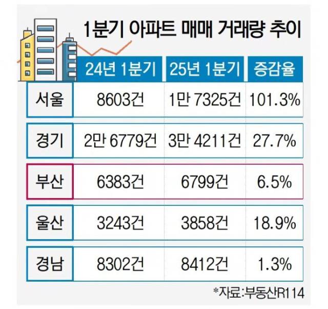 부동산 ‘불장’이 지속되는 서울의 올해 1분기 아파트 거래량이 전년 대비 2배 넘게 증가했다. 반면 부산의 거래량은 6.5% 늘어나는 데 그쳤고, 아파트값 하락세는 만 3년째 이어지고 있어 심각한 양극화가 우려된다.