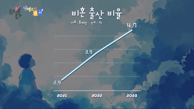 2023년 기준 우리나라의 비혼 출산 비율은 4.7%로, 역대 최고를 기록했습니다. 하지만 다른 나라에 비하면 현저히 낮습니다.