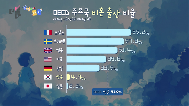 프랑스는 비혼 출산이 열 명 중 여섯 명 정도고, OECD 평균도 40%가 넘습니다.