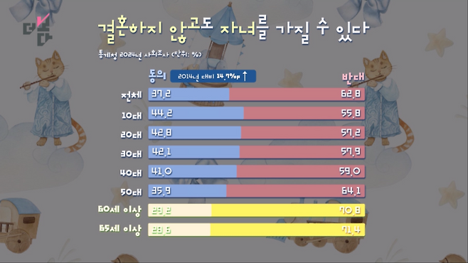 결혼하지 않고도 자녀를 가질 수 있다는 응답은 지난해 37.2%로, 10년 전보다 14.7%p 늘었습니다. 10대의 동의율이 44.2%로 가장 높았습니다. 하지만 60대 이상은 10명 중 7명이 반대하는 등 여전히 반대 비율이 높았습니다.