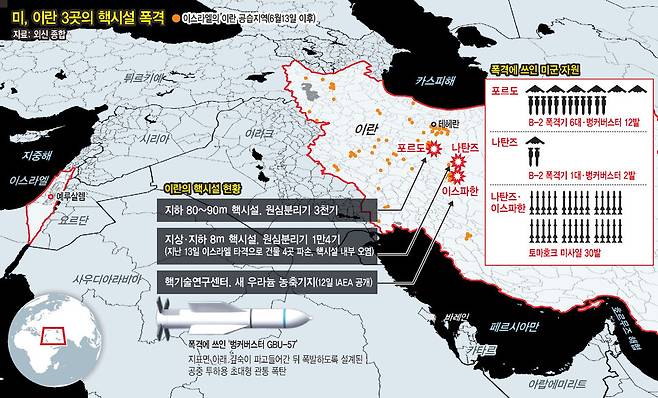 이날 폭격은 오후 6시40분(이란 시각 새벽 2시10분)부터 25분간 이뤄졌다. 트럼프 대통령은 오후 7시47분 소셜미디어 트루스소셜을 통해 이란 핵시설 폭격 사실을 알렸다.