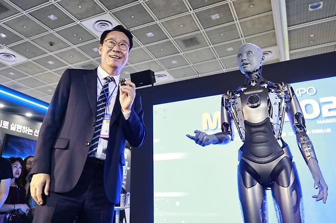 | ▲ 정명근 화성특례시장이 18일부터 20일까지 서울 코엑스 C홀과 컨퍼런스룸 일대에서 열린 AI 엑스포 ‘MARS 2025’에서 세계적인 휴머노이드 로봇 ‘아메카(Ameca)’와 대화를 나누고 있다. |