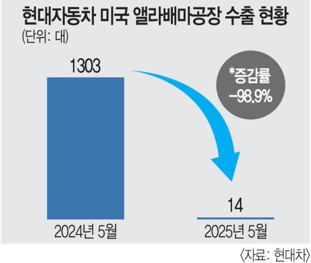 22일 자동차업계에 따르면 현대자동차가 지난달 미국 앨라배마 공장(HMMA)에서 생산해 미국 밖으로 수출한 차량은 단 14대에 그쳤다. 전년 동월(1303대) 대비 98.9%, 전월(2386대) 대비 99.4% 급감한 수치다. 급전직하한 수준이다. 이 공장의 월간 수출량이 100대 아래로 떨어진 것은 2020년 4월 코로나19 팬데믹 초기 이후 처음이다. 지난해 HMMA에서 총 2만2600대를 수출하며 5년 만에 최대 실적을 냈던 점과 대비된다.