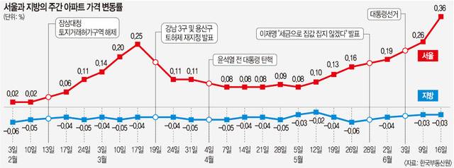 주간 아파트 가격의 누적 변동률을 보면 격차는 더욱 선명하다. 이달 셋째 주까지 서울 아파트 가격이 2.65% 오르는 동안 지방에서는 1.01% 하락했다. 지난해 같은 기간 서울은 0.16% 오르고 지방은 0.95% 떨어졌다. 누적 변동률 격차도 3.3배나 벌어졌다.