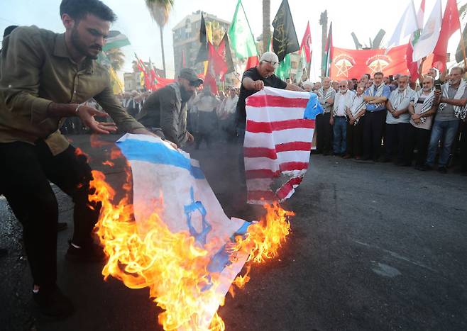 | 중동, 반미 여론 고조 21일 레바논 남부 시돈에서 일어난 대규모 반(反)이스라엘·반미 시위에 참여한 사람들이 이스라엘의 이란 공격을 비판하며 양국 국기를 태우고 있다. 13일부터 이스라엘과 이란의 무력 공방이 이어지면서 중동 전역에서 이스라엘과 공습을 지원한 미국에 대한 반감이 분출되고 있는 가운데, 미국의 참전으로 반미 여론은 더욱 강해질 것으로 보인다. 시돈=AP 뉴시스 |