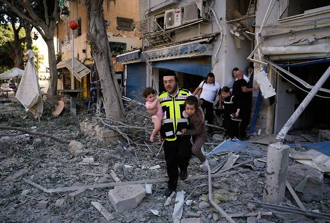 | 이스라엘 민간인들도 큰 피해 22일 이스라엘 북부 거점 도시 하이파에서 이란의 미사일 공격으로 건물이 무너진 가운데 한 구조대원이 어린이 두 명을 대피시키고 있다. 이란은 전날 미국이 이란의 핵 시설 3곳을 직접 타격했고, 이스라엘도 공습을 이어가고 있는 것에 따른 보복 조치로 이스라엘 전역에 탄도미사일을 발사했다. 하이파=AP 뉴시스 |