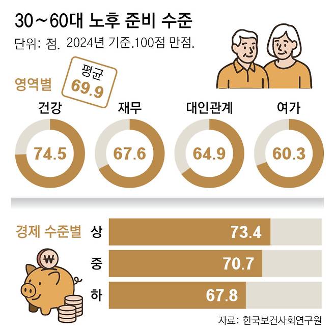22일 한국보건사회연구원의 '2024년 노후준비 실태조사 및 진단지표 세분화 방안 연구'에 따르면 대인관계, 건강, 여가, 재무 등 4개 영역에서 측정한 30∼69세의 노후준비 수준 점수는 100점 만점에 평균 69.9점이었다.