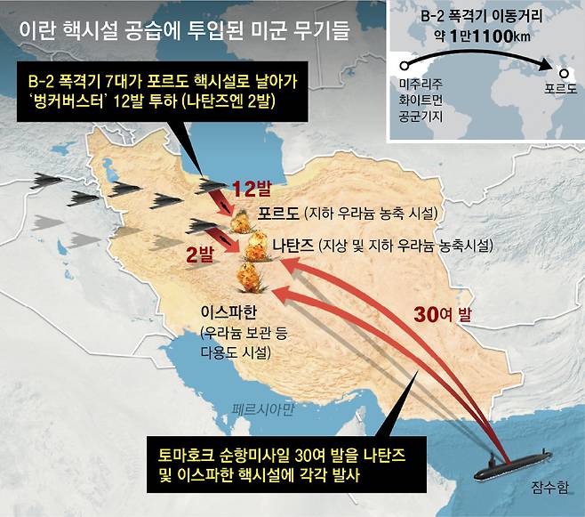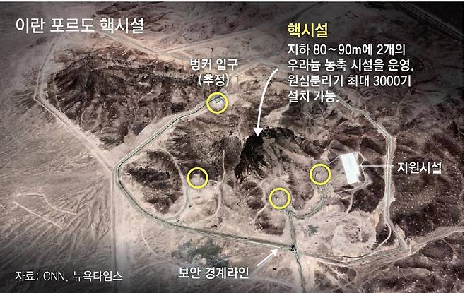[美, 이란 전쟁 참전] 지하 80∼90m 위치 포르도 핵심 타깃 기술센터 이스파한-핵농축 나탄즈 이란 “핵시설 미리 빼 피해 미미” 주장