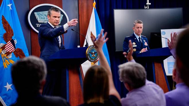 ▲ 댄 케인 미국 합참의장과 피트 헤그세스 국방부 장관이 22일(현지시간) 국방부에서 미군의 이란 핵시설 공습 작전에 대해 브리핑하고 있다.