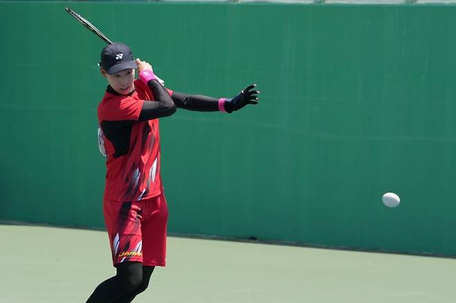 <사진> 코리아컵에서 금메달 4개를 독식한 세계 최강 우에마츠가 언더 컷 서브를 구사하고 있다. 공이 마치 풍선처럼 찌그러져 날아간다. 대한소프트테니스협회 제공