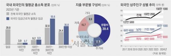[사회] 국내에 91일 이상 상주하는 15세 이상 외국인의 구성을 보면 재외동포(40만명)가 가장 많고 비전문취업(E9, 30만명), 유학·일반연수(20만명), 영주권자(14만명), 결혼이민(12만명) 순이다(통계청, 2024년). 공식적인 상주 외국인 수는 156만명이나 체류자 숫자는 불법 혹은 단기체류자를 포함, 272만명에 달한다. 코로나19 시기를 제외하면 지속적인 증가 추세다. 이 중 고용허가제로도 불리는 E9 비자가 규모나 경제사회적 함의가 큰 것 같다.