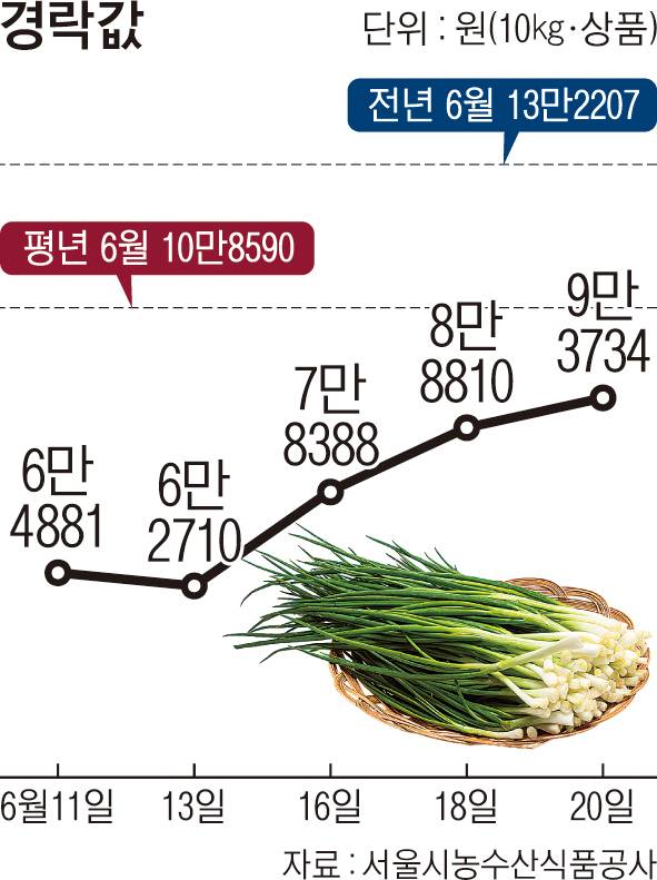 20일 서울 가락시장에서 ‘깐쪽파’는 10㎏들이 상품 한상자당 9만3734원에 거래됐다. 지난해 6월 평균(13만2207원)보다 29.1%, 평년(10만8590원)과 견줘서는 13.7% 낮다.