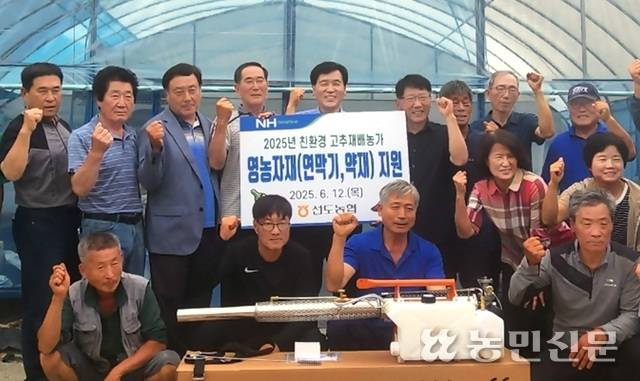 충남 아산 선도농협(조합장 김명규)이 최근 아산시 선장면 죽산1리 친환경고추 재배 작목반(반장 오일섭)에 연막기와 약제 등 1000만원 상당의 영농자재를 전달했다(사진).