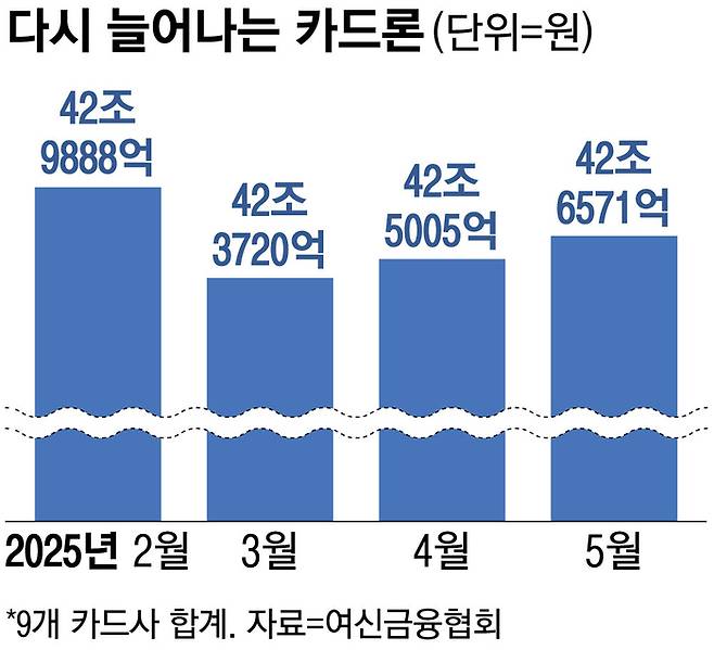 22일 여신금융협회에 따르면 지난 5월 9개 카드사(신한·삼성·현대·KB국민·롯데·하나·우리·BC·NH농협카드)의 카드론 잔액은 42조6571억원으로 전달 대비 1566억원 늘어났다. 올해 1분기 말 부실채권 상각 효과 등으로 감소했던 카드론 잔액이 지난 4월에 이어 두달 연속 증가하고 있다.