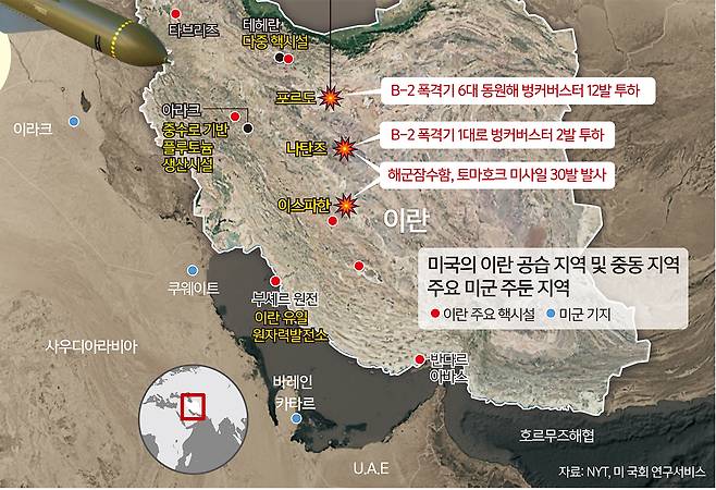 도널드 트럼프 미국 대통령이 21일(현지시간) “이란 내 핵시설에 대한 아주 성공적인 공격을 완료했다”며 밝힌 타격 지점은 포르도, 나탄즈, 이스파한 3곳이다. 이란의 최중요 핵시설로 꼽히는 이 3곳에 미국이 자랑하는 전략자산인 B-2 스텔스 폭격기와 ‘벙커버스터’ GBU-57, 토마호크 미사일 등을 총동원했다.