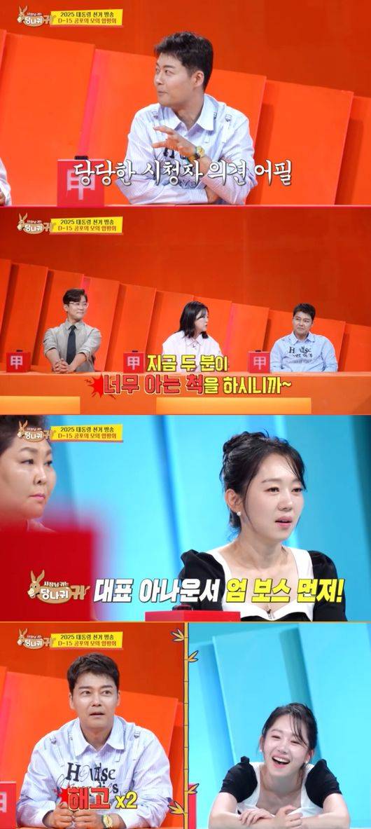 지난 22일 방송된 KBS 2TV 예능 프로그램 '사장님 귀는 당나귀 귀(약칭 사당귀)'에서는 엄지인 KBS 아나운서가 후배 아나운서들과 함께 대선 개표방송 모의 중계 합평회를 하는 모습이 그려졌다.