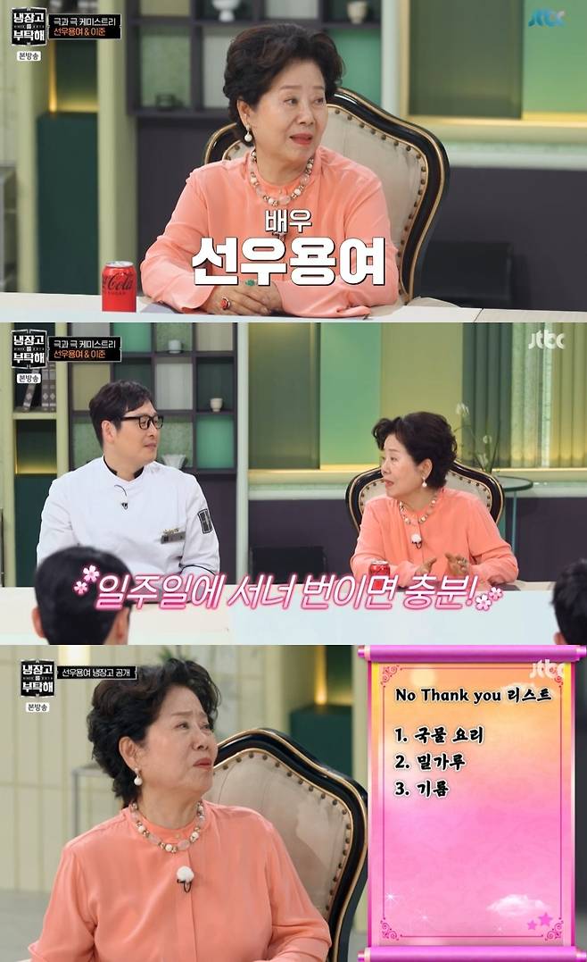 이날 방송에서는 선우용여의 냉장고도 공개됐다. 그는 국물 요리, 밀가루, 기름, 설탕 등을 피하고 해산물을 사랑하는 건강한 입맛을 자랑했다.