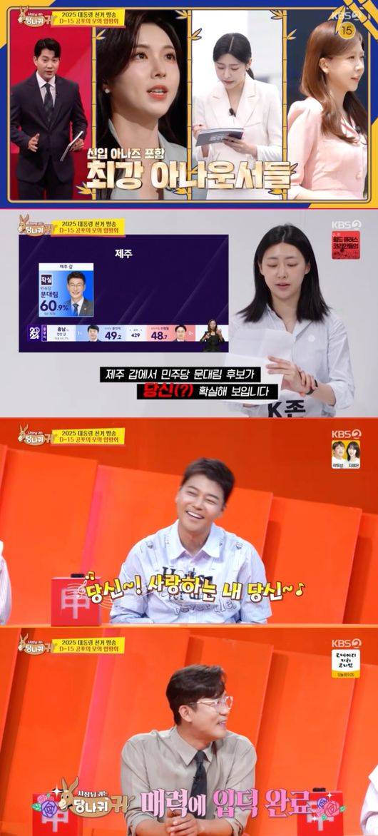 지난 22일 방송된 KBS 2TV 예능 프로그램 '사장님 귀는 당나귀 귀(약칭 사당귀)'에서는 엄지인 KBS 아나운서가 후배 아나운서들과 함께 대선 개표방송 모의 중계 합평회를 하는 모습이 그려졌다.